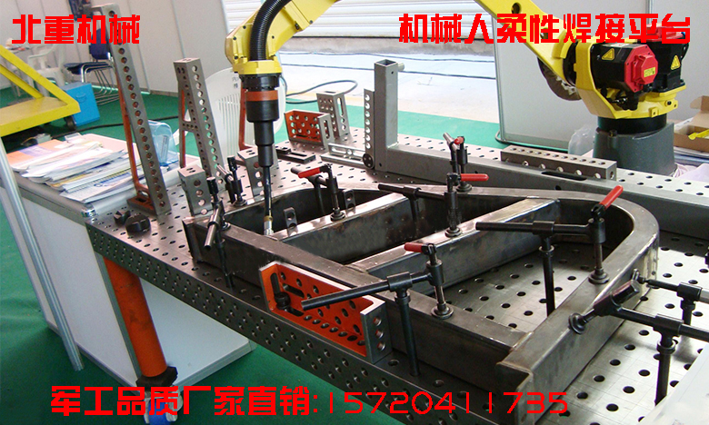 柔性組合工裝夾具是一種三維平面孔系定位夾緊系統,采用標準化、系列化、通用化的模塊組成,所有模塊的鏈接、固定和壓緊都是以孔來定位,用鎖緊銷來實現快速鎖緊,模塊與模塊隨著機器人的應用越來越廣泛,自動化程度的不斷提高,傳統的裝配、焊接工藝裝備已經很難適應生產的要求;經過我們不斷的實驗創新,研發出機器人焊接平臺,從此提高生產效率、降低生產成本、提高產品質量。利用專用夾具附件完成實現產品的高效率、低成本的生產。